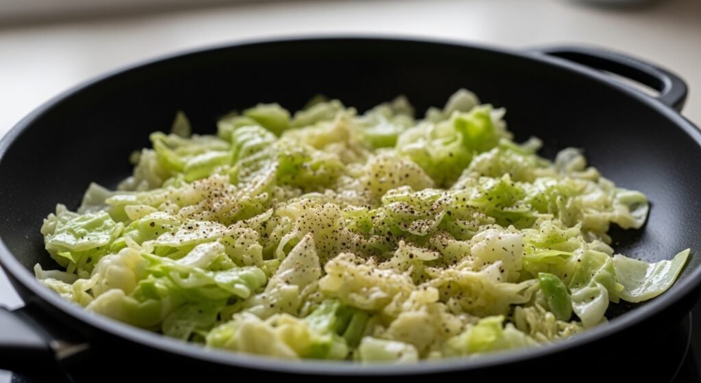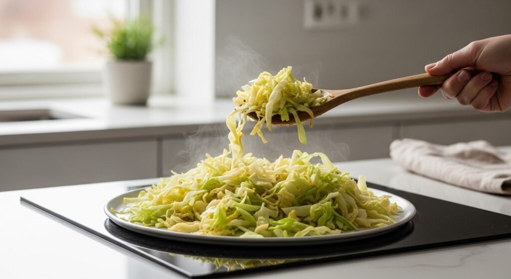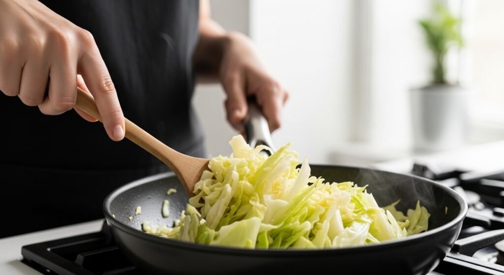 Green cabbage works best for frying because it softens quickly and develops a mild sweetness. Look for a firm head with tightly packed leaves. One medium cabbage is usually enough to serve three to four people as a side dish.