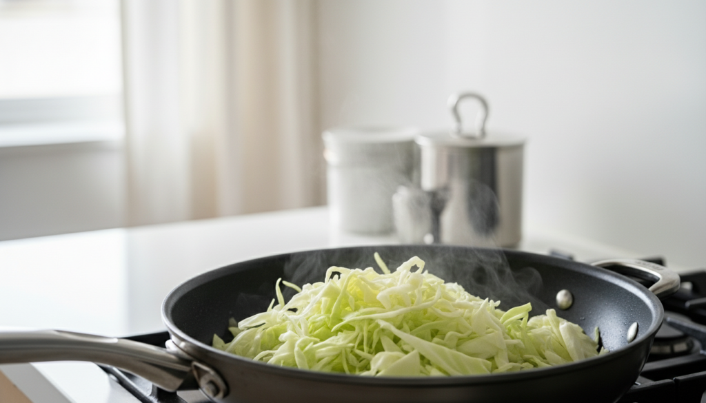 To keep things quick, prep everything before turning the stove. Remove the outer cabbage leaves, cut it in half, remove the core, and slice into thin strips. Dice an onion and mince garlic if you’re using it. Having everything ready prevents overlooking.