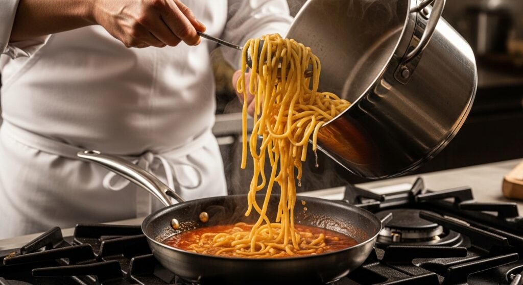 Move pasta immediately from the boiling water into the simmering sauce. Add reserved pasta water in a measure to ensure that the ingredients are emulsified and held together. The method forms a smooth coating that sticks to all the strands and forms very well.