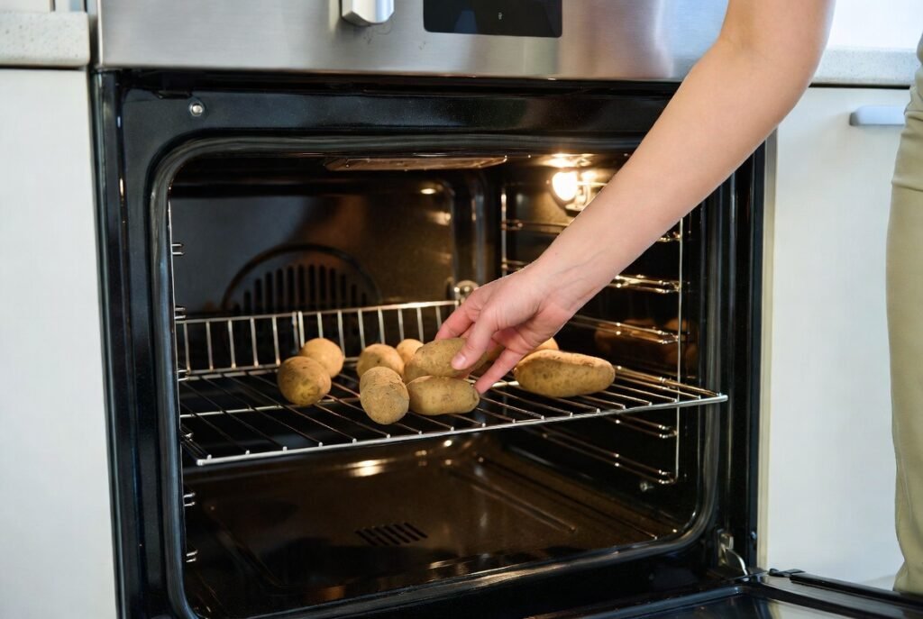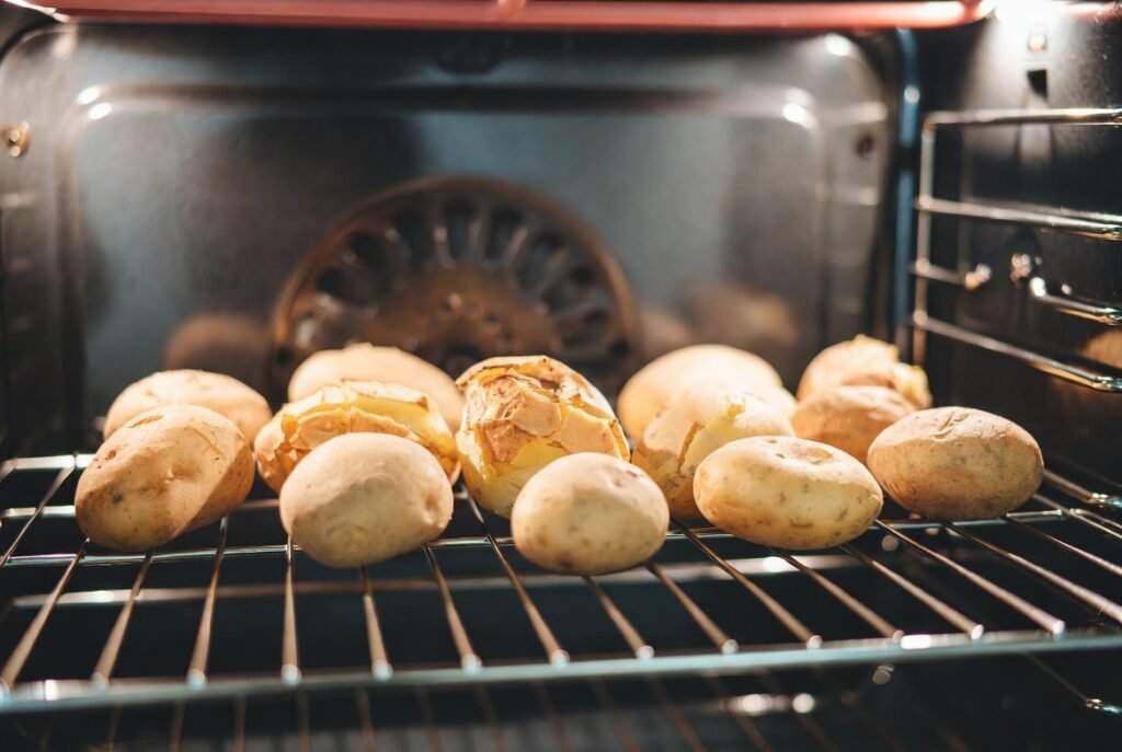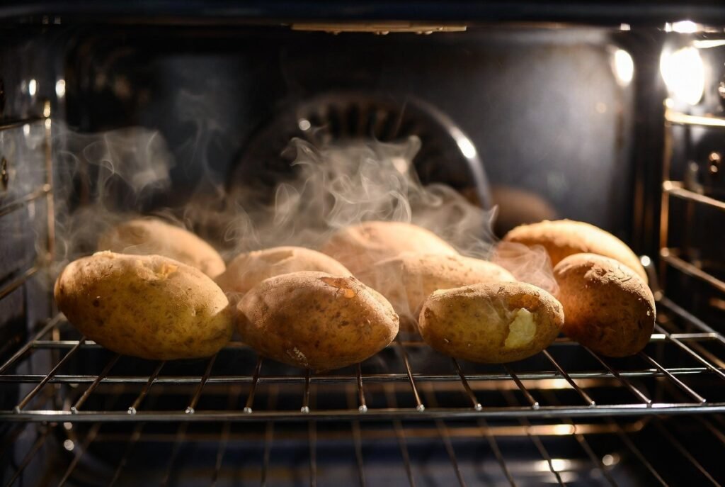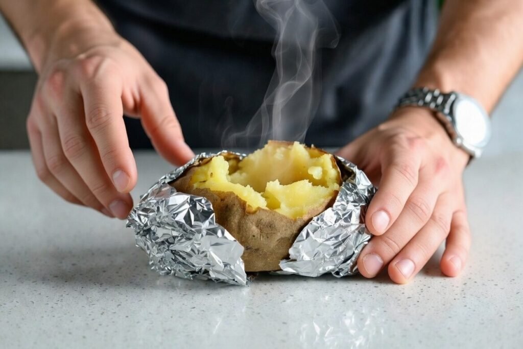 A proper baked potato needs dry heat moving across its surface, especially under the skin. If you cover it with foil, that movement stops – so the skin stays wet instead of cracking. Heat touching every part separately brings out what people expect: a firm edge giving way to softness within.